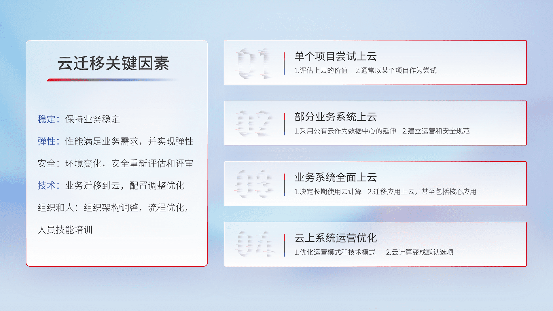 结合实际业务,,,,从规划设计、、、云平台选型、、、、云原生改造、、数据迁移、、集成交付,,,迁移全过程为客户识别最佳上云路径,,做好风险识别管理,,,,设计网络架构、、、、身份权限、、、安全审计合规、、操作审计、、、、日志审计、、、、监控告警策略、、、、多站点容灾设计等,,,对云上基础设施进行整体规划,,提升IT治理水平,,以满足弹性、、高可用、、高性能的需求。。