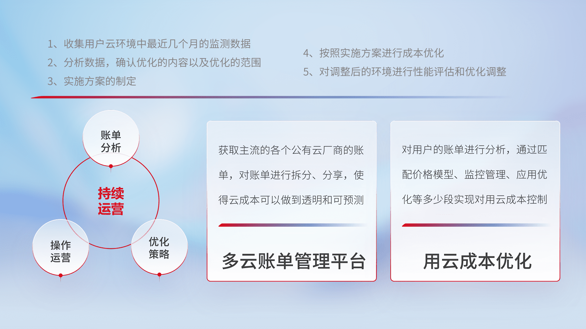 通过多云纳管,,以统一的资源数据模型把客户的云资源进行抽象和封装,,,,进而实现对多云资源的统一操作,,,保障云资源管理的可靠性、、、、稳定性与可用性。。量身定制化运维内容,,,配置、、、、开发运维、、、、补丁管理、、、备份、、、监控、、、、认证和访问管理、、、审计和日常巡检等,,,保障在用云过程中的可靠度,,,,稳定度以及高可用率。。