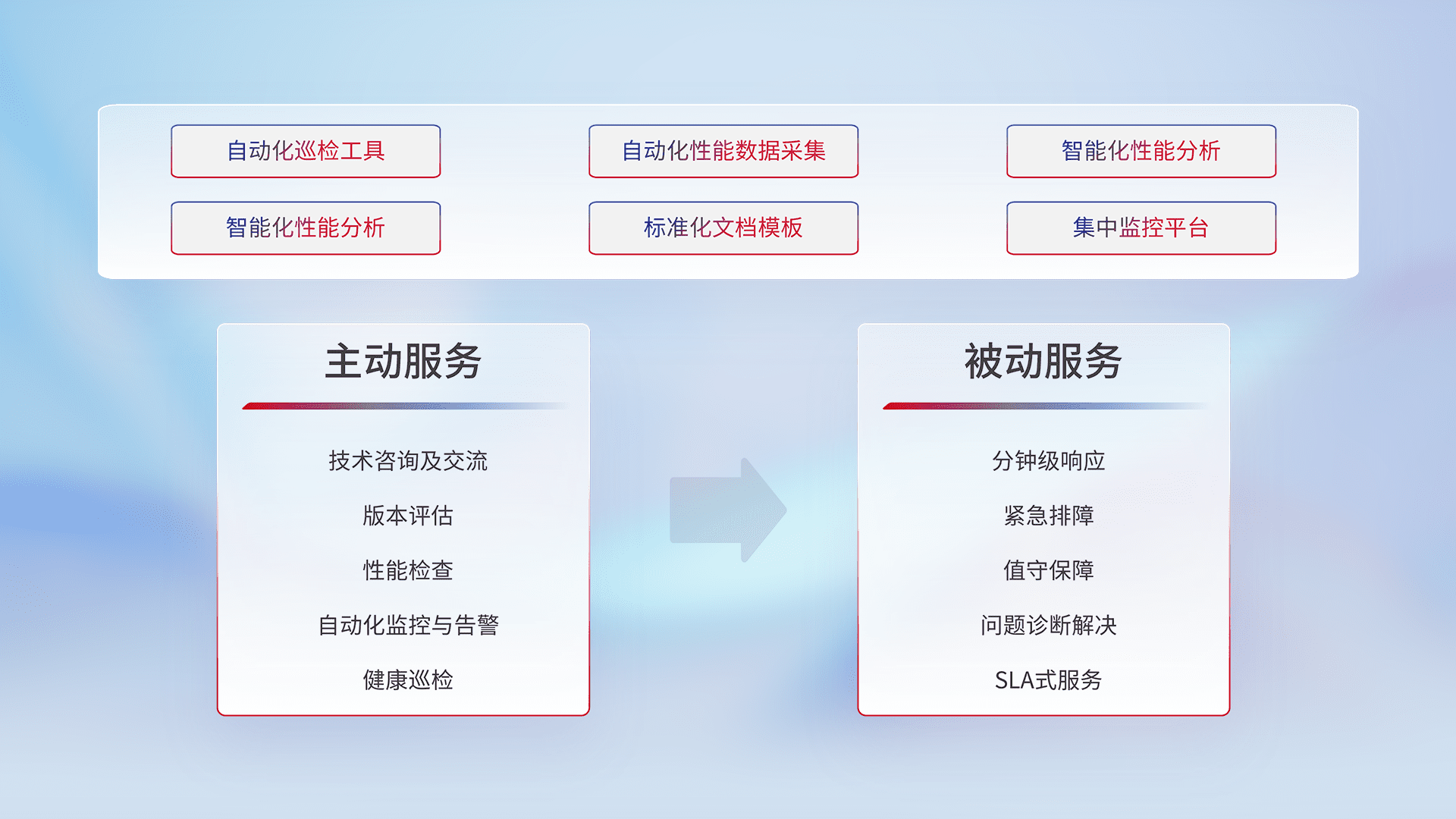 智能化工具和标准化文档,,保障服务质量,,,,提供主动服务(包含技术咨询、、、、版本评估、、性能检查、、自动化监控与告警、、、、健康巡检)和被动服务包含(分钟级响应、、、、紧急排障、、、值守保障、、问题诊断解决、、、、SLA服务)。。。。